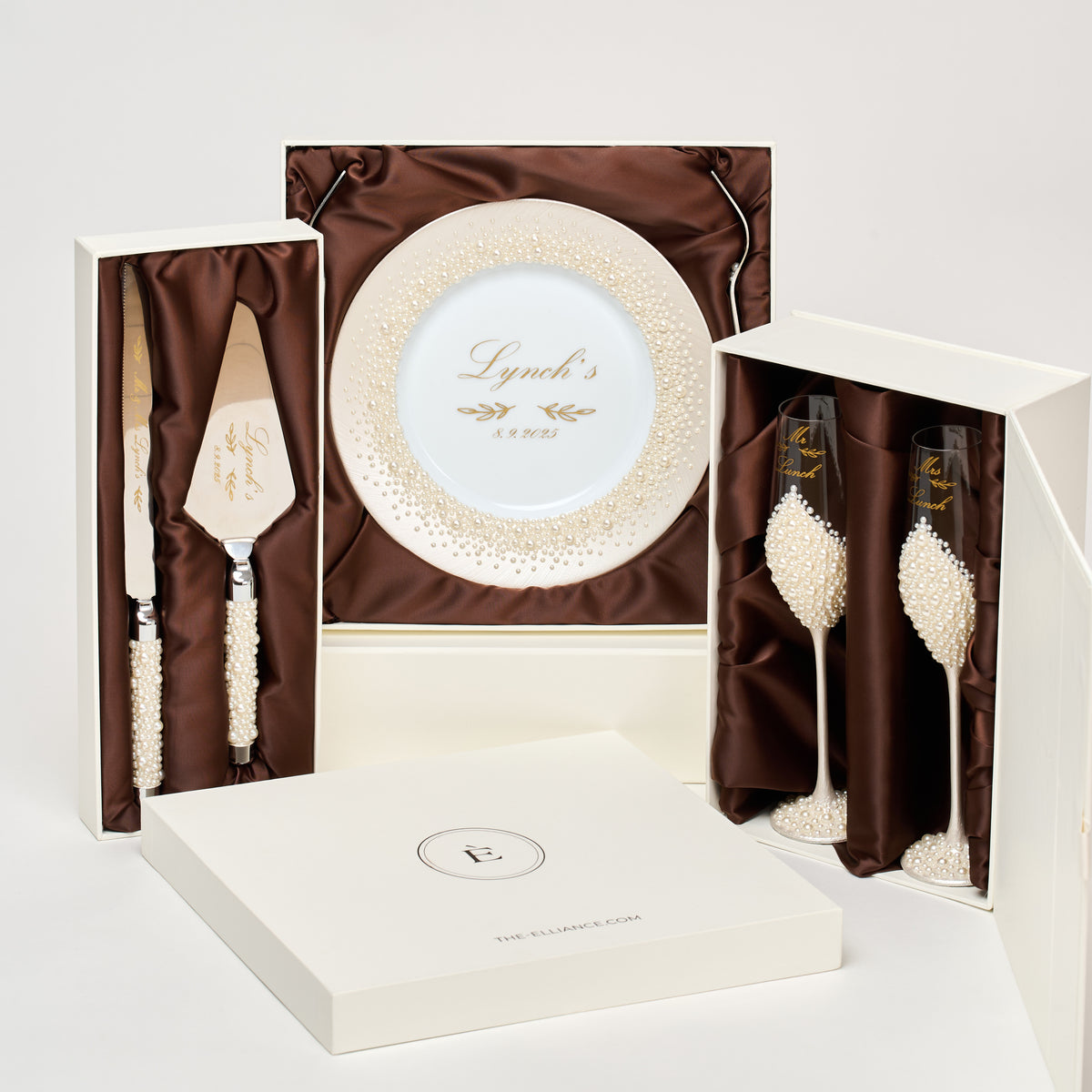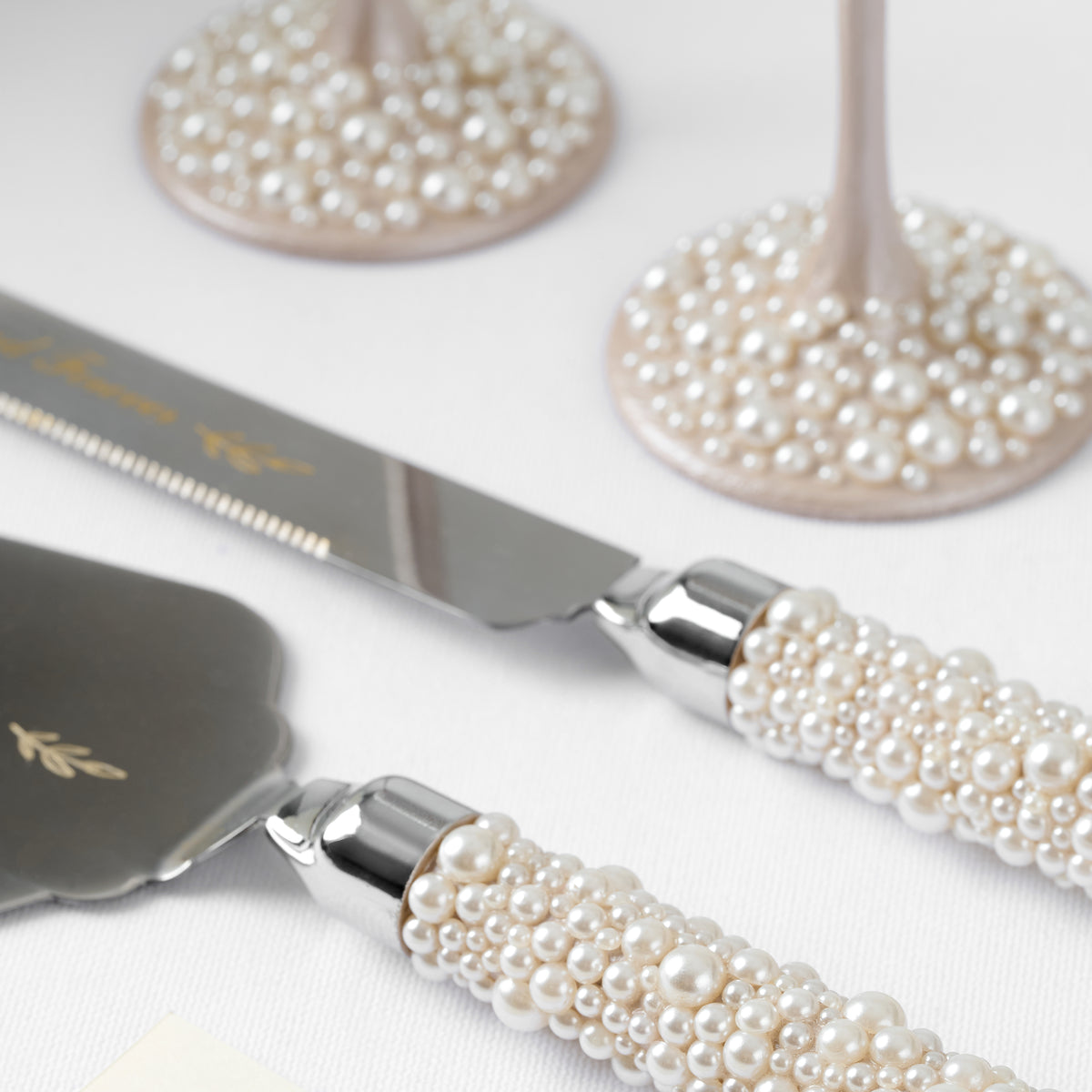 Celebrate with The Èlliance's Handcrafted Personalized Engraved Pearl Ivory Cake Knife and Server set. Each handcrafted tableware piece is designed to add elegance and luxury to any special occasion.