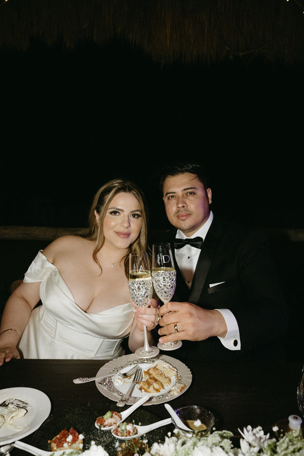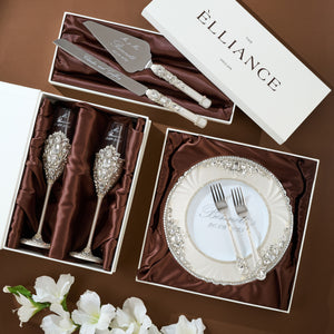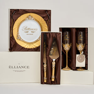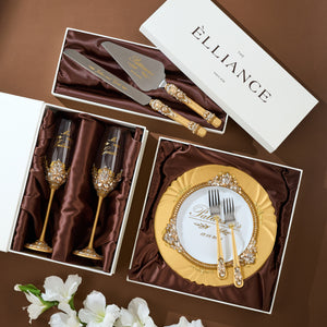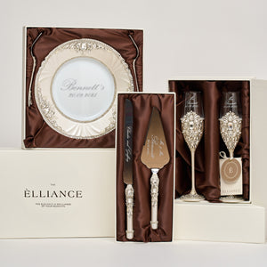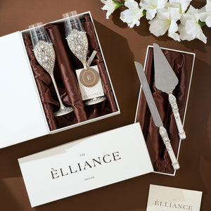 Celebrate with The Èlliance's Personalized Engraved Ivory Flutes & Cake Knife Server Classic set. Each handcrafted tableware piece is designed to add elegance and luxury to any special occasion.